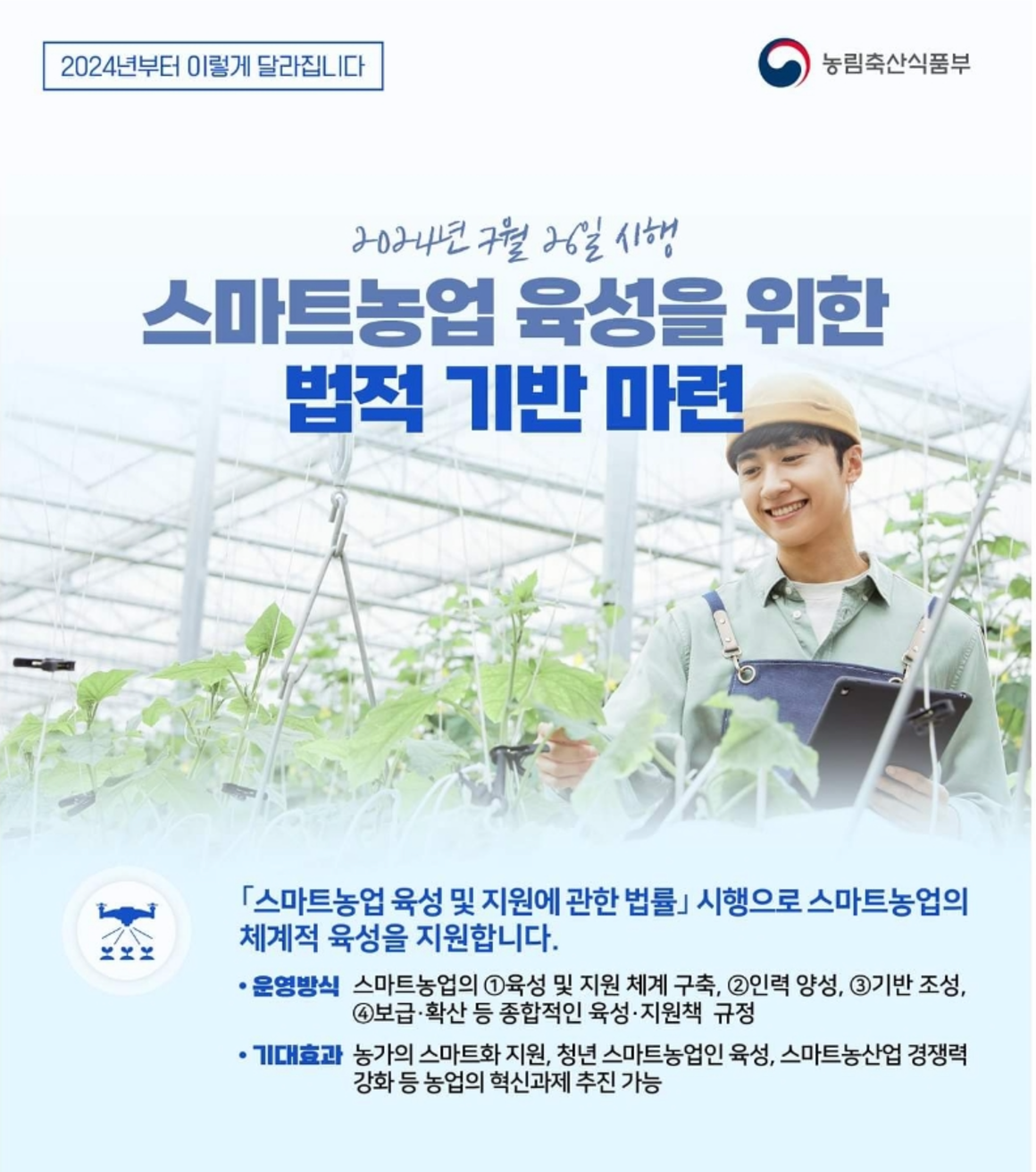 오는 2027년까지 스마트농업 생산비중이 30%까지 확대될 전망이다. 농림축산식품부는 오는 26일부터 스마트농업 육성 및 지원에 관한 법률을 시행한다고 25일 밝혔다. 제1차 스마트농업 육성 기본계획(2025~2029)을 마련해 농업인과 기업이 주도적으로 농업혁신생태계를 이끌어갈 수 있도록 종합지원 추진체계를 구축한다. [출처] 대한민국 정책브리핑(www.korea.kr)